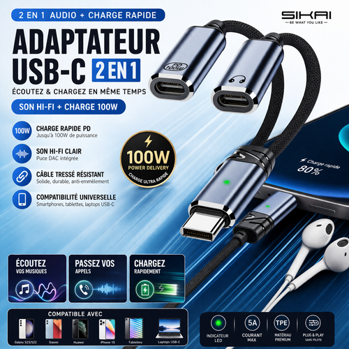 🔌 Adaptateur USB-C 2 en 1 Audio + Charge Rapide 100W PD – Câble Tressé Casque & Recharge Type-C Compatible Android