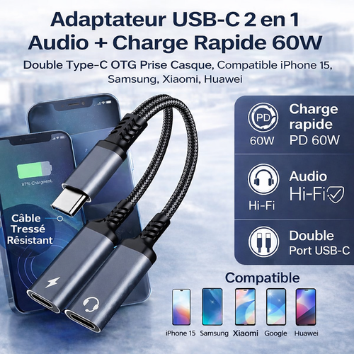 Adaptateur USB-C 2 en 1 Audio + Charge Rapide 60W 🔌 – Câble Tressé Résistant, Double Type-C OTG Prise Casque, Compatible iPhone 15, Samsung, Xiaomi, Huawei