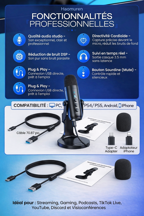 Microphone USB Condensateur Haomuren 🎤 – Qualité Studio, Plug & Play, Anti-bruit, Streaming & Gaming PC/Mac/PS5